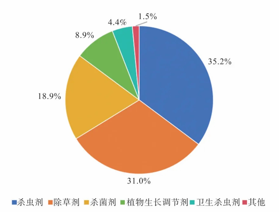 1.2 登记类别 2024年取得登记的农药产品中,杀虫剂876个,除草剂772个,杀菌剂471个,植物生长调节剂222个,卫生杀虫剂110个,其他37个。杀虫剂、除草剂、杀菌剂3大类占登记总量约85%(图1)。